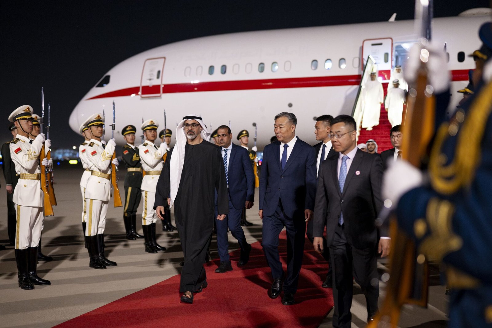 Sheikh Khaled is accompanied by a high-level delegation that includes Sheikh Zayed bin Mohamed bin Zayed Al Nahyan; Khaldoon Khalifa Al Mubarak, chairman of the Executive Affairs Authority and special envoy to China; Sultan Ahmed Al Jaber, minister of industry and advanced technology and ADNOC managing director and CEO; Mohamed Hassan Alsuwaidi, minister of investment; and Thani bin Ahmed Al Zeyoudi, minister of foreign trade, among other senior officials.
